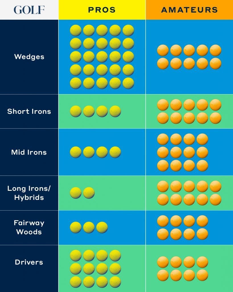 Sebuah artikel tulisan Luke Kerr-Dineen (Golf, 11/9) menampilkan studi tentang beda pola latihan pegolf pro dan amatir seperti tampak dalam gambar. Intinya adalah pegolf pro akan memberi porsi latihan terbanyak pada pukulan yang paling menentukan skor permainan; sebaliknya pegolf amatir porsi latihan terbanyak ada pada pukulan yang paling mudah & menyenangkan.