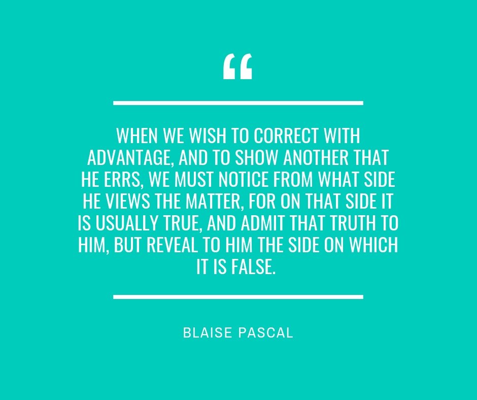 Ini adalah nasihat filsuf, fisikawan, dan matematikawan abad ke-17 Blaise Pascal. Intinya tidak ada orang yang suka dikatakan kalau pendapatnya salah, apalagi di muka umum. Selain itu benar-salah relatif tergantung sudut pandangnya.