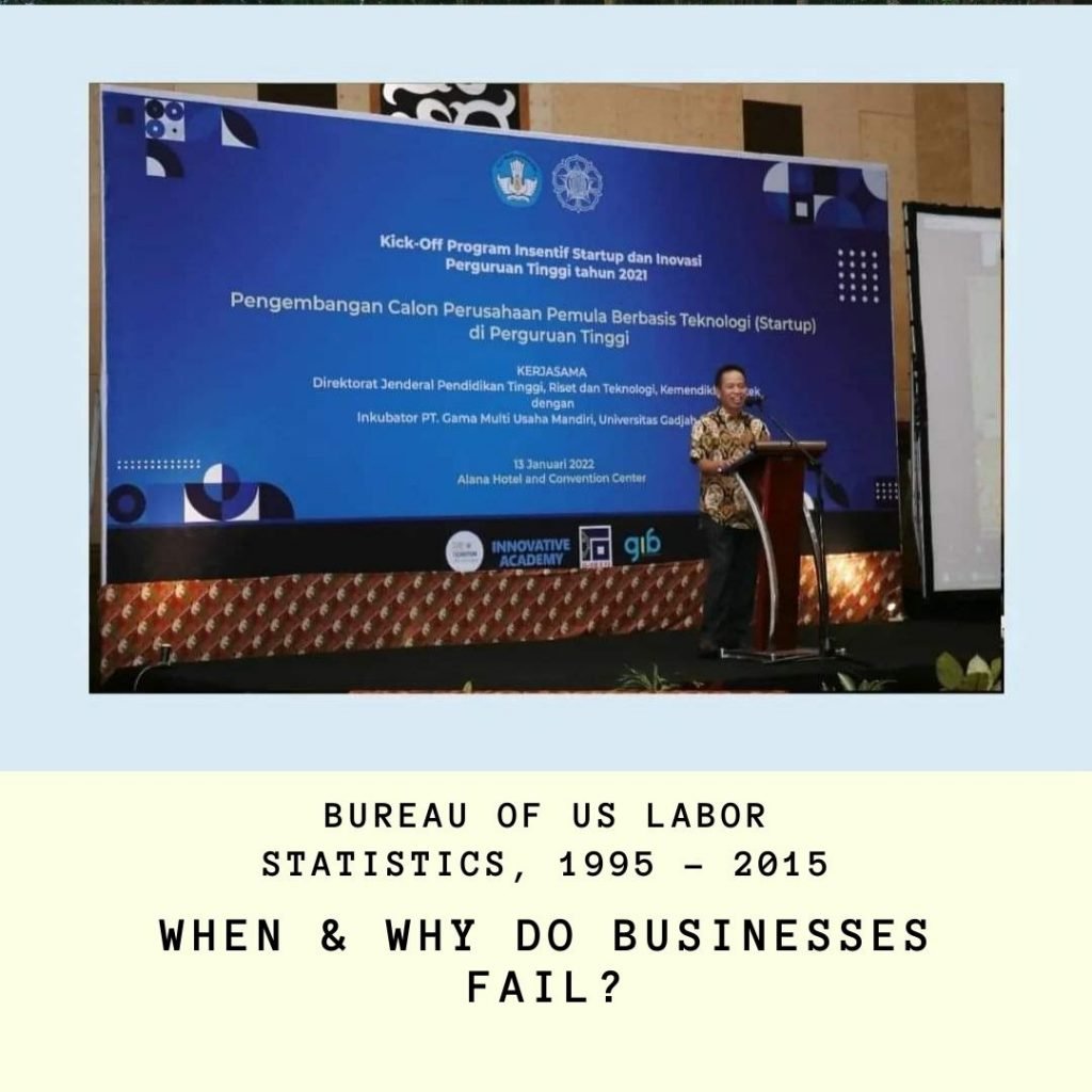 Saat memberikan sambutan pada acara penyerahan hibah penelitian & inovasi Perguruan Tinggi 2021 dari Kemendikbudristekkepada para peneliti/inventor, saya mengutip hasil penelitian Biro Ketenagakerjaan AS perihal risiko kegagalan usaha rintisan. Penelitian selama 20 tahun (1995 – 2015) di AS tsb menyampaikan fakta yang “mengecilkan hati” para pelaku usaha rintisan. Diungkap bahwa 20% usaha rintisan di AS sudah langsung berguguran setahun setelah beroperasi. Dan dalam kurun waktu 5 tahun setelah beroperasi, separuh dari usaha rintisan tsb sudah almarhum. Akhirnya, setelah melewati 2 dasawarsa, usaha rintisan yang masih bertahan tinggal 20%.
